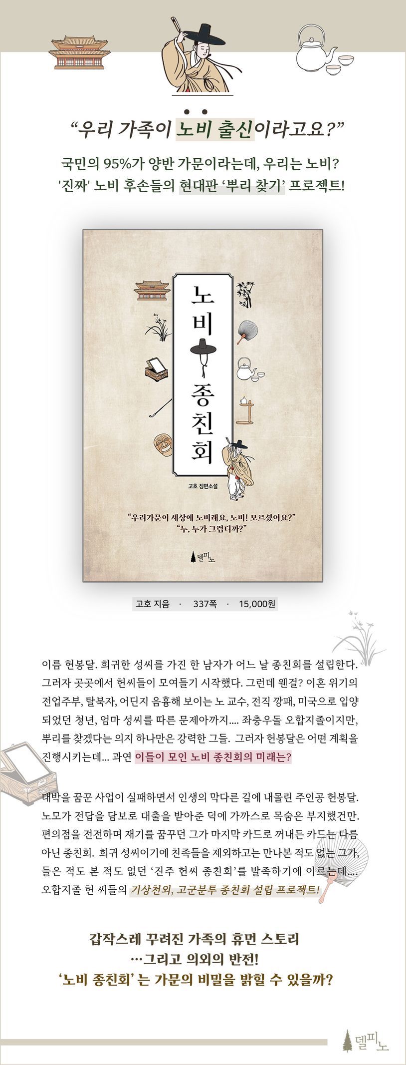 헌봉달. 대한민국에 듣도 보도 못한 희귀한 성씨를 가진 한 남자가 어느 날 종친회를 설립한다. 희귀 성씨인만큼 찾는 이가 뜸할 줄 알았다. 불행인지 다행인지 곳곳에서 헌씨들이 나타나기 시작하는데, 그런데 웬걸? 이혼 위기의 전업주부, 탈북자, 어딘지 음흉해 보이는 노 교수, 전직 깡패, 미국으로 입양되었던 청년, 엄마 성씨를 따른 문제아까지. 그야말로 좌충우돌 오합지졸이 아닐 수 없다. 그래도 나름 뿌리를 찾겠다는 의지 하나만은 강력하다. 종친회에서 감투 하나씩 맡은 이 많은 뱃사공들 틈에서 회장 헌봉달은 은밀한 계략을 진행시키는데... 과연 노비 종친회의 미래는?