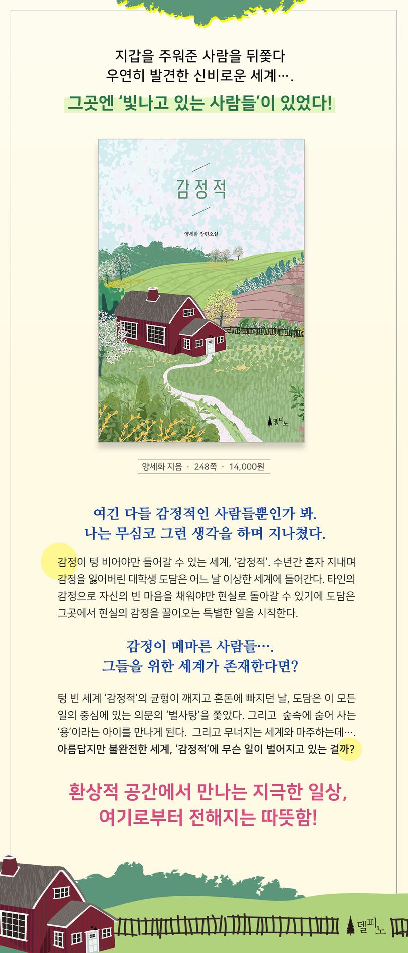 소설 『감정적』은 각각의 이유로 상처받은 사람들이 다시 자신의 소중한 감정을 채우고 일어서는 과정의 기록이다. 하나도 특별할 것 없는 보통의 것들 - 오로지 자기 자신에게 집중하는 시간, ‘감정적’의 아름다운 풍경, 좋은 사람들과 나누는 대화 - 이것을 통해 상처받은 이들은 세상을 살아갈 용기를 회복한다. 이들은 ‘감정적’이란 공간에서 비로소 매 순간 진심으로 하루를 보내는 각자의 방식을 터득하고 세상 밖으로 용기 내어 걸음을 내딛는다.