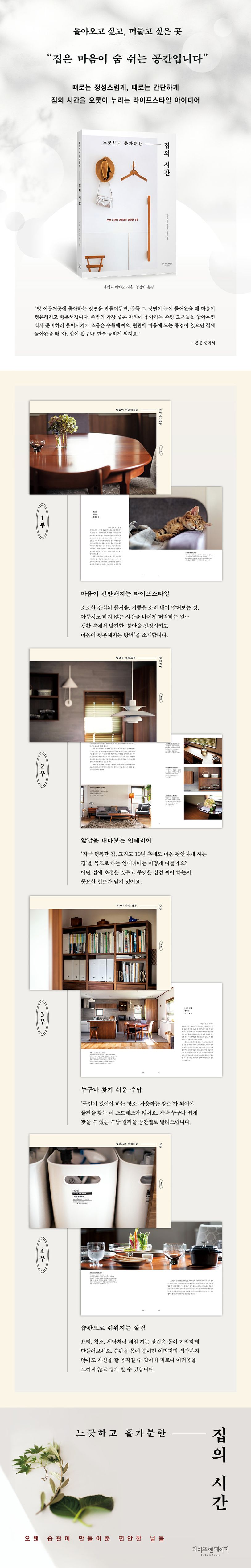 총 4부에 걸쳐 1부 심리적으로 평온함을 유지할 수 있는 라이프스타일, 2부 앞날을 내다보는 인테리어, 3부 가족 누구나 기억하기 쉬운 수납법, 4부 습관으로 쉬워지는 살림법을 소개하는 이 책은 단순히 실용적인 정보뿐만 아니라 생활 철학이 담긴 글과 정갈한 사진을 통해 마음 편안하게 산다는 것이 무엇인지 감각적으로 보여준다. 책을 읽는 것만으로도 힐링이 될 뿐만 아니라, 다 읽고 나면 간결한 삶을 위해 당장 정리를 시작해보고 싶어질 것이다.