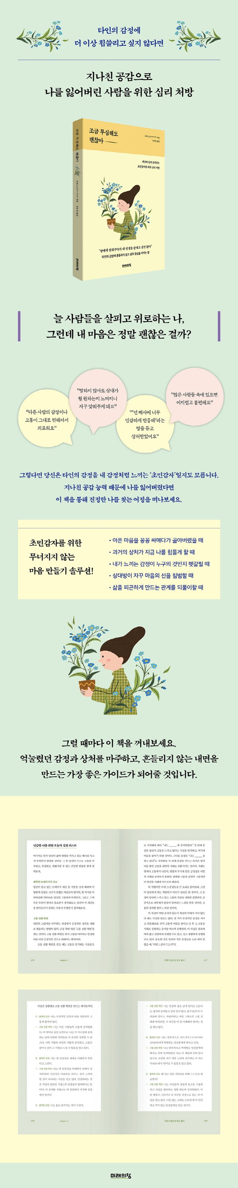 많은 초민감자를 치료해온 저자 오라 노스는 이 책에서 민감한 사람을 위한 효과적인 감정 작업과 훈련을 제시한다. 외면했던 어두운 감정과 상처를 직면하고 인정할 때 우리는 진정한 내적 성장을 이룰 수 있다. 이 책에 나오는 방법들은 감정을 그대로 인정하고 공감 능력을 제어하도록 도와주는 최고의 훈련이다. 작은 것부터 하나씩 실천한다면 더 이상 타인의 감정에 휩쓸리지 않는 강인한 초민감자로서 살아갈 수 있을 것이다. 남에게 공감하고 맞춰주다가 나를 잃어버렸다면 이 책을 통해 진정한 나를 찾는 여정을 떠나보자.