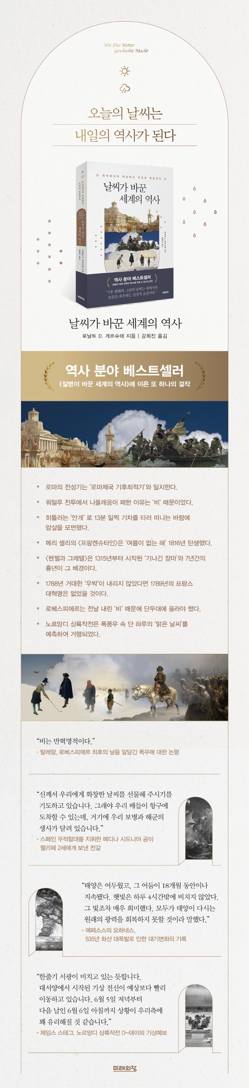 로마제국의 번영과 멸망, 무적함대를 격파한 잉글랜드의 해군, 나폴레옹의 워털루 전투 패배, 연합군의 노르망디 상륙작전, 프랑스 대혁명의 전조였던 흉작, 전대미문의 전염병 창궐, 〈프랑켄슈타인〉이라는 걸작의 탄생까지. 날씨와 기후변화는 인류 역사에 거대한 족적을 남겼다. 고대부터 현대의 기후 위기에 이르기까지 흥미로운 사례를 통해 세계사의 변곡점마다 등장한 날씨의 영향력을 알아본다.