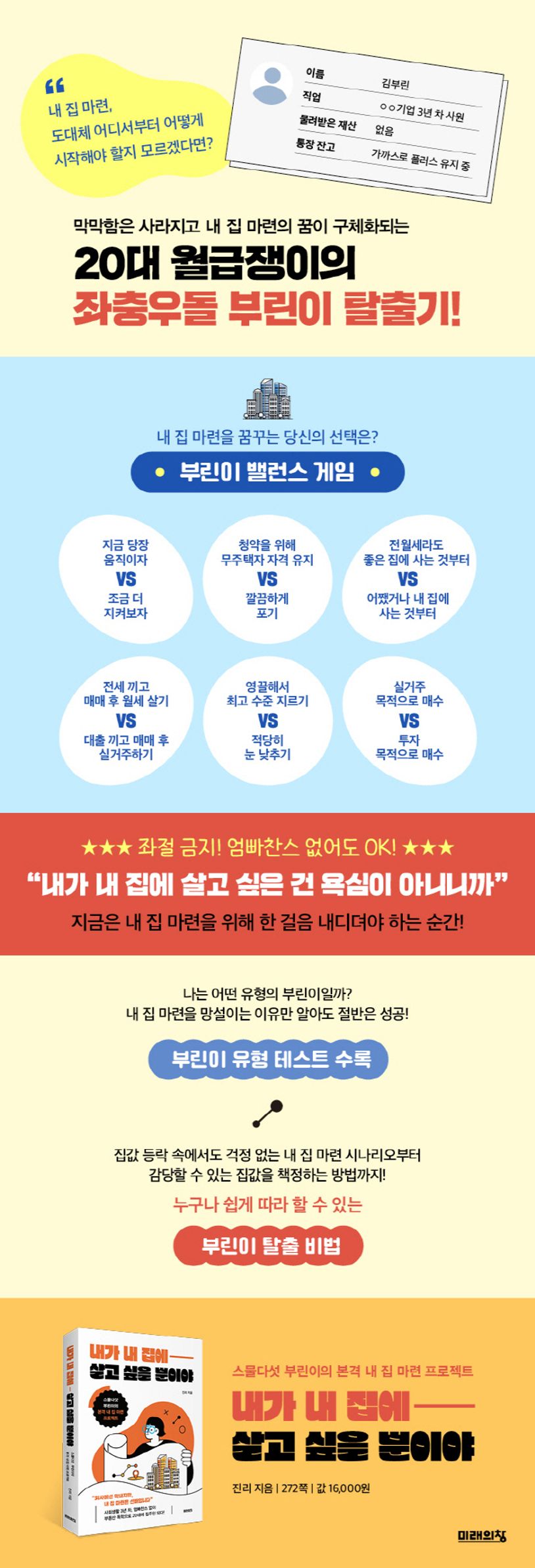 월세와 전세를 전전하던 사회생활 3년 차, 저자는 부모님의 지원 없이 하나는 대출을 끼고 또 하나는 전세를 껴서 아파트 두 채를 구매했다. 두 채를 합쳐도 금액이 많지 않고, 지금도 여전히 남의 집에 세 들어 살며 4년 뒤 내 집에 입주하기 위해 전세금을 모으는 중이지만, 저자는 일련의 내 집 마련 과정을 겪으며 ‘왕초보 부린이’에서 ‘부동산 좀 아는 부른이’로 성장할 수 있었다. 몸으로 부딪히며 겪은 생생한 경험담과 독학으로 터득한 부동산 노하우를 유쾌하게 풀어낸 이 책은 누구라도 지금 당장 내 집 마련을 향해 한 발자국 내디딜 수 있는 용기와 실행 의지를 선물해주기 충분하다. 평범한 20대 월급쟁이의 부린이 탈출 비법을 하나씩 따라가다 보면, 어느새 막막함은 사라지고 내 집 마련의 꿈이 구체화되는 놀라운 경험을 하게 될 것이다.
