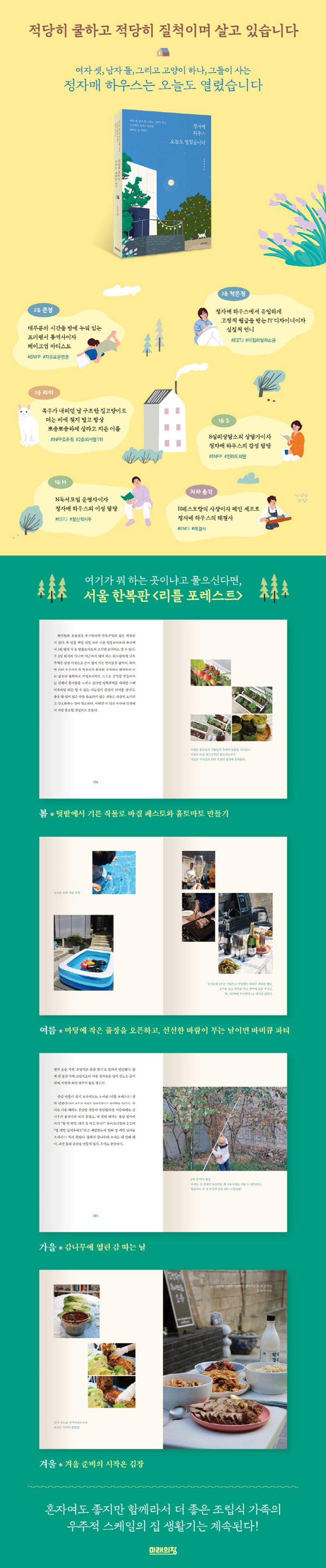 30대 두 자매가 결혼과 아파트 신혼집 대신 서울 한복판에 40년 된 오래된 단독주택을 사면서 벌어진 일들을 담고 있는 이 책은 집과 그 집에서 함께 사는 사람들의 이야기를 통해 집이라는 세계와 가족의 의미를 새롭게 제시한다. ‘집에서 잠만 잘 순 없잖아요’를 외치는 바깥양반 동생 때문에 대부분의 시간을 방에서 누워 보내는 안사람 언니가 ‘잠’만 자던 집이라는 공간에서 가족도 친구도 아닌 타인과 함께 살며 독서모임, 미술교실, 플리마켓 등을 열고, 텃밭도 가꾸고, 곶감도 만들고, 김장도 하며 작고 소박한 공동체를 만들어가고 있다. 좋아하는 사람들과 좋아하는 것을 하며 오늘을 행복하게 살고 있는 ‘정자매 하우스’는 오늘도 열려있다.