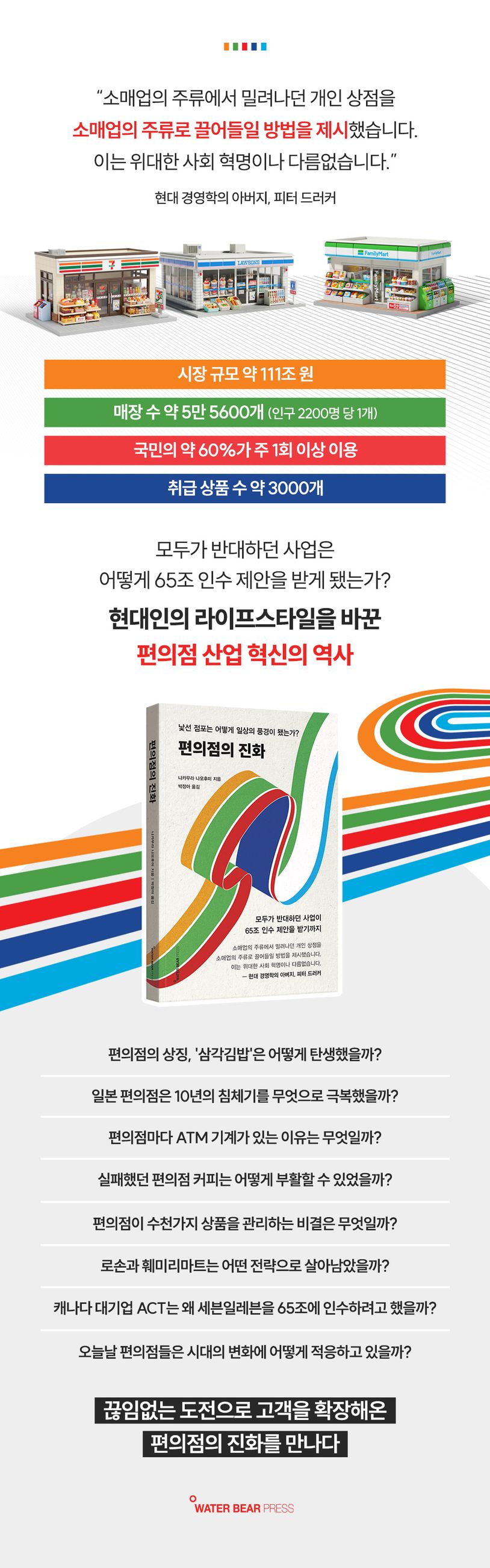 편의점이 없는 동네는 없다고 말해도 무방할 정도로 현대인의 라이프스타일에 깊이 관여하고 있다. 그러나 편의점이 이렇게 성장한 것이 당연한 일은 아니었다. 편의점이 막 생겨나던 1970년대에도 편의점의 정체성을 확립하지 못해 흔들렸고, 2000년대에도 ‘마의 10년’이라는 정체기를 맞았다. 여러 위기를 극복하고, 50년간 끊임없이 고객을 확장해 온 혁신의 역사가 오늘날의 편의점을 만들었다.