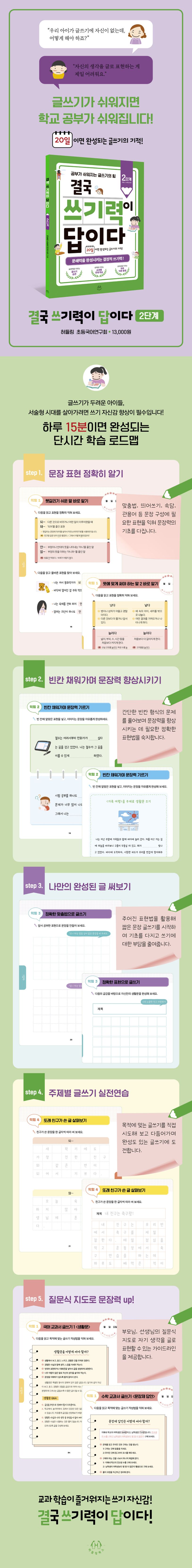 《결국 쓰기력이 답이다》는 아이들이 글쓰기에 대한 두려움을 버리고 매일매일 ‘쓰기력’을 기를 수 있도록 구성했습니다. 한 권의 책으로 어휘력은 물론 독해력, 창의력까지 향상시킬 수 있게 학년 별로 P단계(예비 초등 1학년 대상)와 1단계(초등 1~2학년 대상), 2단계(초등 3~4학년 대상)로 나눈 것이 특징이다. 또한, 4주 완성이라는 구체적인 학습 플랜을 제시함으로써 20일이라는 기간 안에 아이들이 체계적으로 ‘쓰기력’을 높일 수 있도록 돕습니다.