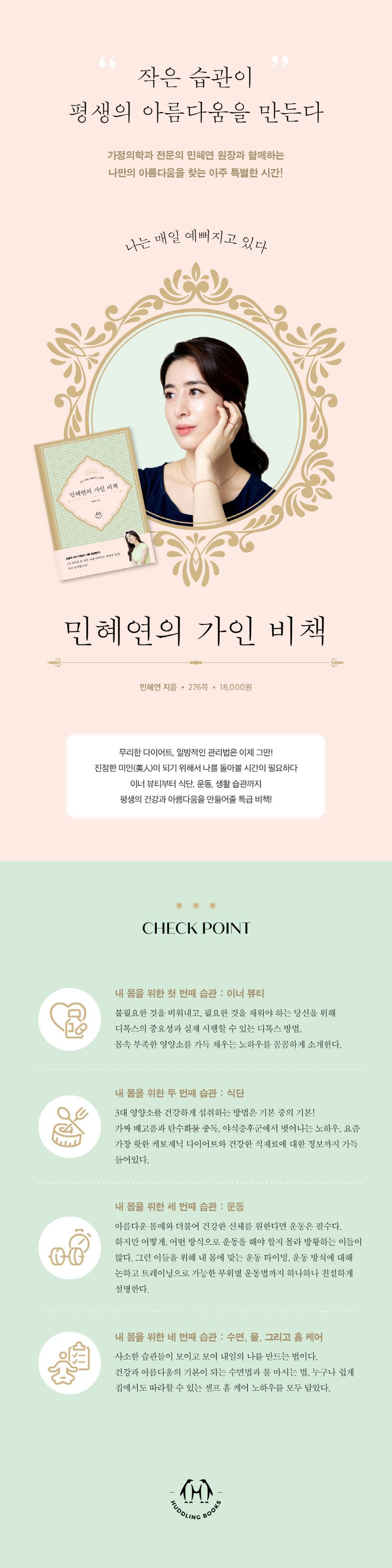 ‘작은 습관이 평생의 아름다움을 만든다’라는 말이 있다. 올바른 습관을 통해 예전과는 다른 건강하고 아름다운 삶을 꿈꾼다면, 《민혜연의 가인 비책》이 훌륭한 길라잡이가 되어 줄 것이다.