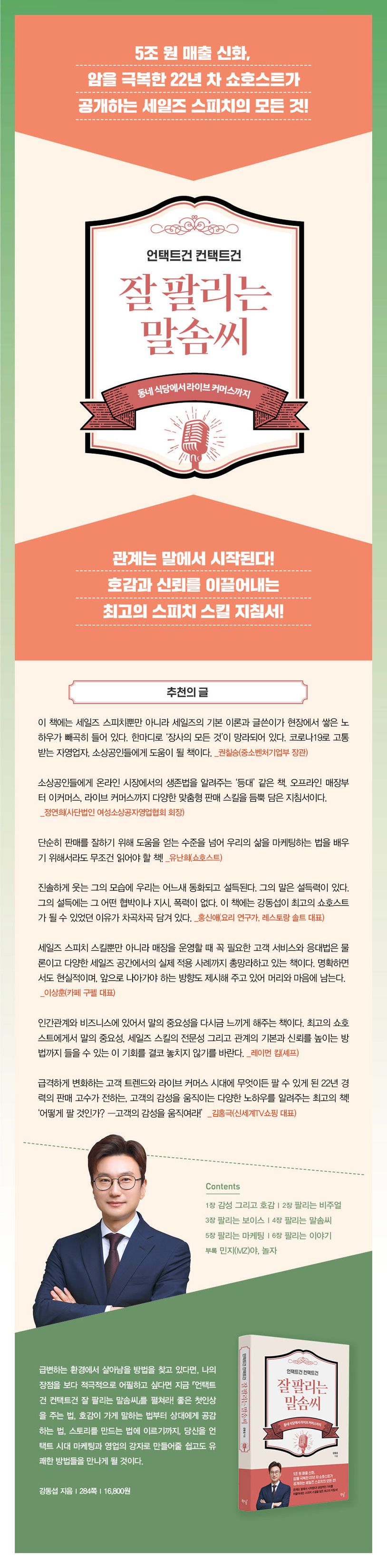 급변하는 환경에서 살아남을 방법을 찾고 있다면, 나의 장점을 보다 적극적으로 어필하고 싶다면 지금 『언택트건 컨택트건 잘 팔리는 말솜씨』를 펼쳐라! 좋은 첫인상을 주는 법, 호감이 가게 말하는 법부터 상대에게 공감하는 법, 스토리를 만드는 법에 이르기까지, 당신을 언택트 시대 마케팅과 영업의 강자로 만들어줄 쉽고도 유쾌한 방법들을 만나게 될 것이다.