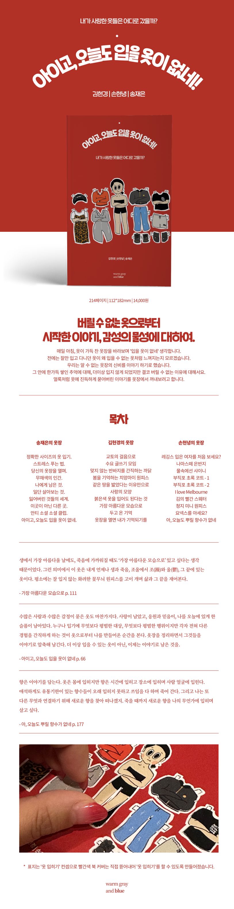 〈아이고, 오늘도 입을 옷이 없네〉는 옷장 앞에서의 마음을 담은 제목이지만, 부제 '내가 사랑한 옷들은 어디로 갔을까?'라는 말처럼, 결국 입을 옷보다는 입어왔던 옷들에 대한 애정과 기억으로 이루어진 책입니다.