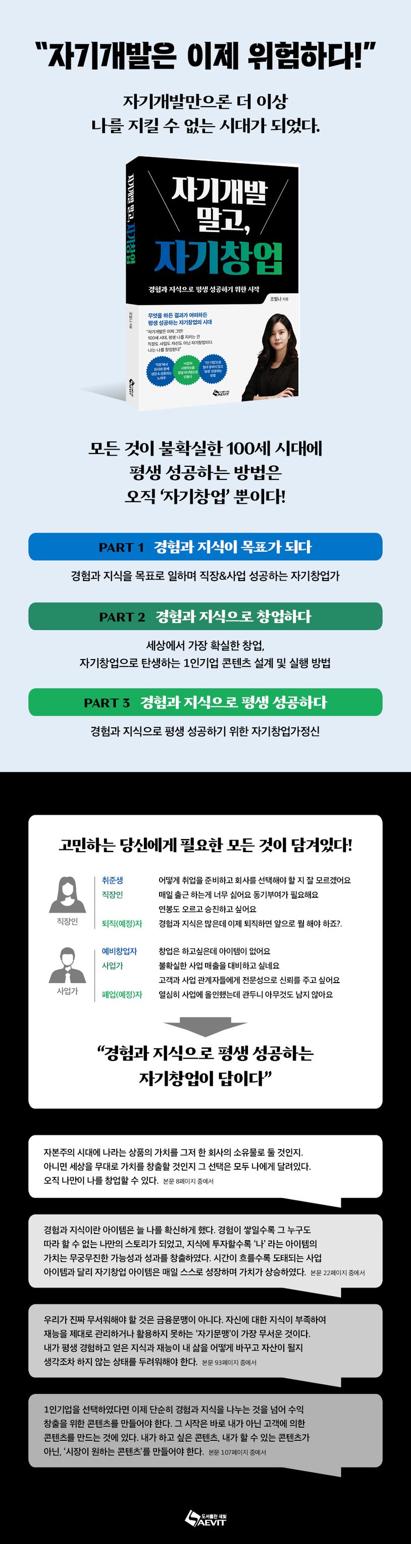 자기개발이 위험한 시대가 왔다! 개발만으로는 더 이상 나를 지킬 수도 살아남을 수도 없다. 이젠 스스로 가치를 만들고 수익을 창출해야 살아남을 수 있는 자기창업의 시대가 도래한 것이다.