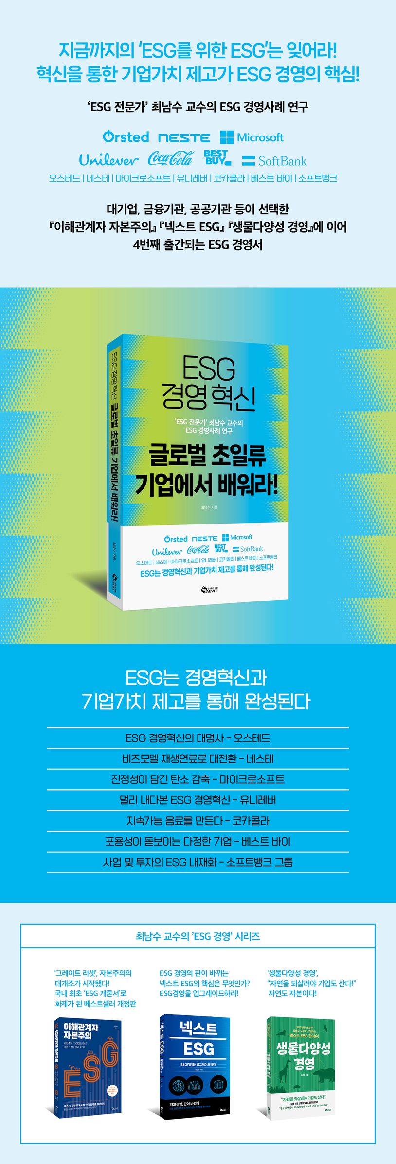 국내 최초의 ESG 도서인 ‘이해관계자 자본주의(이젠 ESG 경영시대!)’를 펴낸 데 이어 ’넥스트ESG’와 ‘생물다양성 경영’ 등 3종의 ESG 도서를 출간한 ESG 전문가 최남수 서정대 교수(전 YTN대표이사)는 ESG 네 번째 저서인 신간 ‘ESG 경영혁신, 글로벌 초일류 기업에서 배워라!’에서 ‘ESG를 위한 ESG’를 하는 오류를 경고하며 ESG는 경영혁신을 통해 기업가치를 제고하는 일임을 강조하고 있다. 최 교수는 이런 관점에서 경영혁신을 통해 기업가치를 끌어올린 오스테드, 네스테, 마이크로소프트, 유니레버, 코카콜라, 베스트 바이, 소프트뱅크 그룹 등 7개 글로벌 초일류 기업의 ESG 경영사례를 국내 기업의 역할 모델로 제시하고 있다. 이 점이 다른 ESG 도서와 차별화되는 대목이다. 신간이 다룬 7개 글로벌 초일류 기업은 대표적인 ESG 등급평가 기관인 MSCI로부터 최상위 평가(AAA 또는 AA)를 받은 기업들이다. 이들 기업은 에너지, IT, 생활용품, 음료, 유통, 금융 등 다양한 업종에 분포돼 있어 산업별로 차별화된 ESG 경영의 특성을 살펴볼 수 있는 이점 또한 있다.