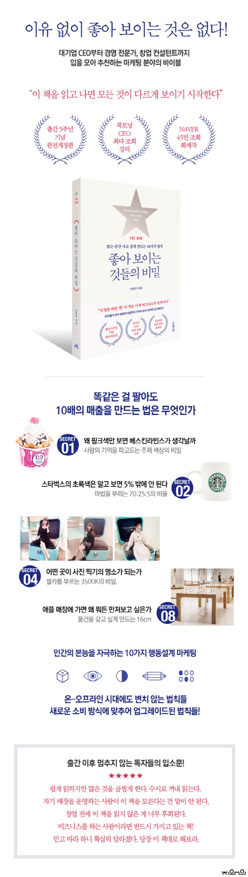 사람이 ‘좋다’고 느끼는 데는 반드시 과학적인 이유가 있다. 일반인의 눈에는 잘 보이지 않지만, 같은 물건도 어떻게 보여주느냐에 따라 저절로 사고 싶은 욕구가 생긴다. 인간의 오감을 어떻게 자극하느냐에 따라, 한번 보았을 뿐인데 기억에 오래 남고 다시 가고 싶은 곳이 된다. 색상, 배열, 각도, 동선 등 작은 것 하나로도 확실한 차이를 만들어내는 법칙들은 무엇일까. 이제 보는 즉시 끌리고, 사고 싶은 마음을 불러일으키게 만드는 비밀들. 인간의 본능을 자극하는 10가지 행동설계 마케팅이 공개된다.