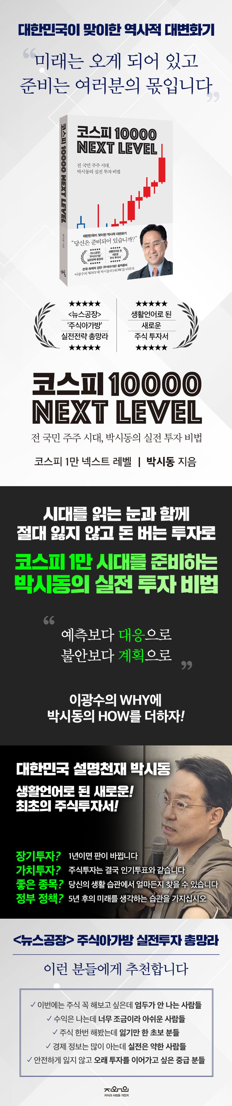 『코스피 1만 넥스트 레벨』은 박시동 소장의 실전형 투자 비법을 본격적으로 체계화한 첫 결과물이다. 전 국민이 코스피 1만 시대를 준비하기 위해 반드시 알아야 할 원칙과 전략을 담은 안내서다. 한국 주식시장이 넥스트 레벨로 도약할 수 있는 역사적 조건, 투자자로 거듭나기 위한 필수 마인드셋, 종목 선택부터 매수·매도·포트폴리오 관리, 초보도 이해할 수 있는 차트와 재무제표 분석법, 고수들도 잊지 말아야 할 체크리스트까지 실전에 바로 적용할 수 있는 구체적 원칙을 단계별로 설계한다.