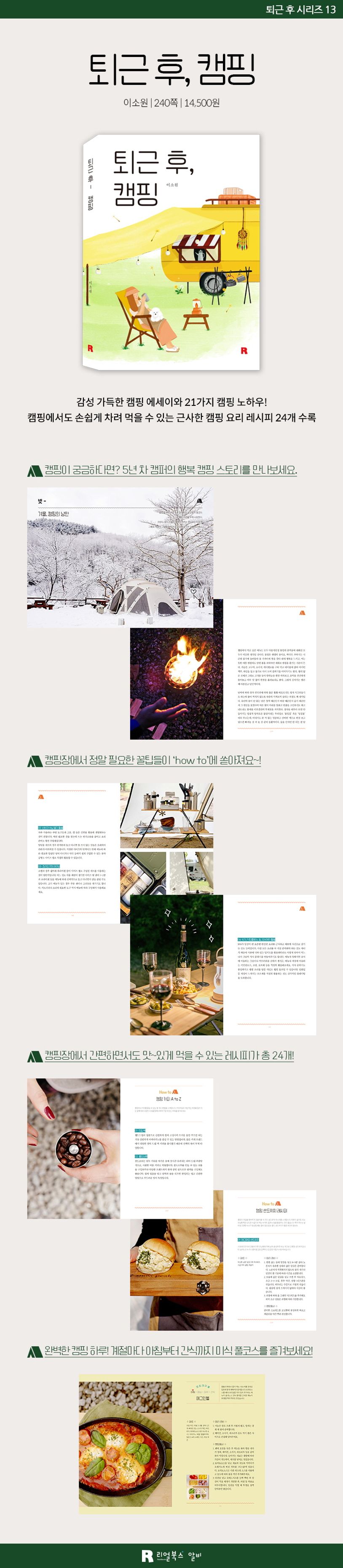 언택트와 힐링. 두 가지 키워드를 모두 충족시키는, 요즘 가장 주목받는 취미 활동은 단연코 ‘캠핑’일 것이다. 각종 예약과 캠핑용품 구입은 점점 치열해지고 마니아들만이 즐기던 다양한 형태의 캠핑이 대중화되면서 캠핑은 현재 최고 전성기를 누리고 있다. 시간적, 금전적 투자가 불가피한 캠핑의 특성상 시작하기 전에 많은 고민이 되기 마련이다. 〈퇴근 후, 캠핑〉에서는 캠핑을 사랑하는 친한 친구와 즐거운 수다처럼, 5년 동안 작가가 경험한 재미있는 캠핑 에피소드와 현장에서 즉각 적용 가능한 현실적인 캠핑 꿀팁 21가지를 쉽고 친절하게, 작가만의 감성을 가득 담아 제공한다. 또한 캠핑에서 빠질 수 없는 맛있는 캠핑 요리 레시피 24가지를 담고 있다. 〈퇴근 후, 캠핑〉 레시피의 핵심은 “이렇게 간편하게 차릴 수 있다니!” 소리가 나올 정도로 간편한 방법으로 보기에도 좋고 맛도 좋은 캠핑 음식 완성에 있다. 조리 환경 세팅부터 레시피까지 차근차근 따라 하다 보면 어느새 책 속의 멋진 캠핑 테이블이 눈앞에 차려져 있을 것이다. 뿐만 아니라 언제 먹어도 맛있지만 각 계절에 먹으면 더욱더 맛있고 캠핑의 분위기를 살려 줄 특별 레시피를 아침, 점심, 저녁, 간식까지 완벽한 하루 코스로 만들어 제공한다. 때로는 캠핑의 달인이나 전문가의 완벽한 조언보다 어느 정도 연차가 쌓인 ‘즐기는 사람’의 경험담이나 조언이 더 현실적이고 와닿기도 한다. 어느새 아침저녁 공기에서 선선한 가을이 느껴진다. 캠핑 떠나기 좋은 계절. 캠핑을 사랑하는 친구 같은 〈퇴근 후 캠핑〉과 함께 올가을 나만의 감성을 담은 캠핑 레시피를 만들어 보는 어떨까.