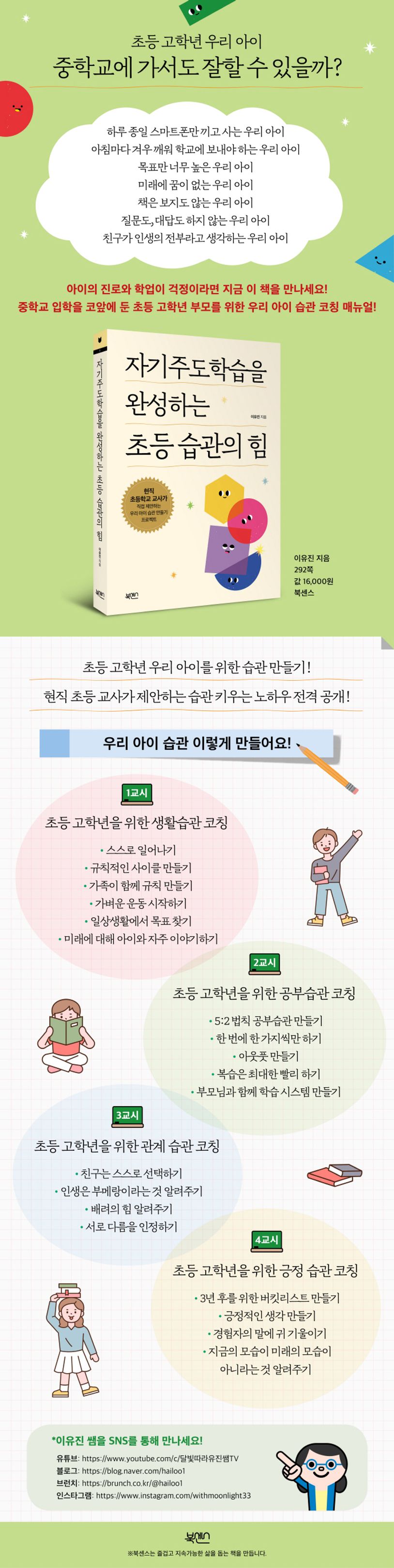 초등 고학년 시기, 아이의 사춘기가 시작되었거나 이제 본격적으로 입시제도의 세계로 다가가는 아이의 진로와 학업이 고민인 부모라면 꼭 필요한 《자기주도학습을 완성하는 초등 습관의 힘》. 아이들의 습관만 잡아줘도 아이는 스스로 무언가 성취하는 기쁨을, 더 나아가 올바르게 성장할 수 있는 토대를 만들 수 있을 것이다. 초등 고학년, 더 이상 놓쳐서도 미뤄서도 안 될 아이의 습관을 위해 중요한 시기임을 잊지 말자.