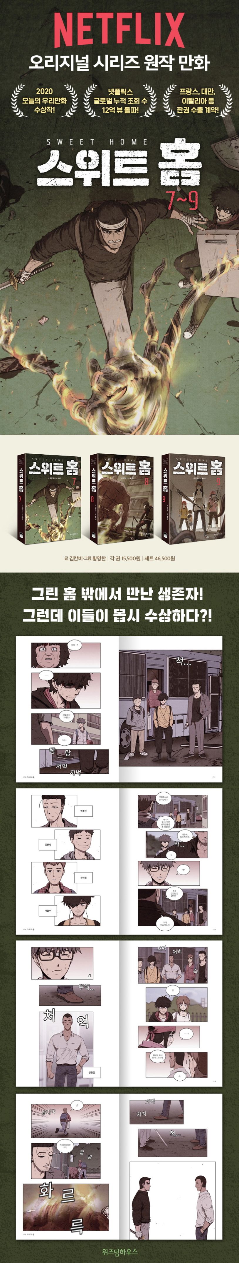 2017년 10월부터 2020년 6월까지 네이버웹툰에서 인기리에 연재된 『스위트 홈』 7~9권이 동시 출간된다. 연재 기간 내내 금요 웹툰 절대 강자 자리를 놓치지 않았던 『스위트 홈』은, 지난 2020년 12월에 넷플릭스에서 방영되자마자 8개국 1위라는 기염을 토하며 화제성과 작품성을 두루 인정받았다. 나아가 국내 대표 만화상인 ‘2020 오늘의 우리 만화상’에 선정되며 한국형 크리처물의 새로운 가능성을 보여주었다.