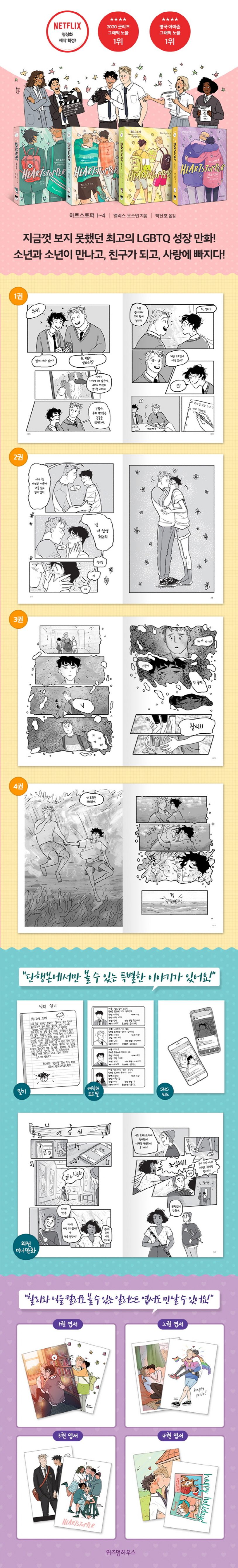 ‘넷플릭스 영상화 제작 확정!’, ‘2020 굿리즈 그래픽 노블 부문 1위’, ‘영국 아마존 그래픽 노블 1위’에 빛나는 『하트스토퍼』가 한국에 정식 출간되었다. 영국 남자 중등학교에 다니는 소년 찰리와 닉의 사랑 이야기를 담은 이 책은, 성별을 넘어 누군가를 사랑하는 일이 얼마나 멋진 일인지 보여주는 따뜻하고 아름다운 책이다. 소년들의 사랑을 엿보며 더 나은 세상으로 나아갈 수 있는 기회를 얻게 될 것이다.