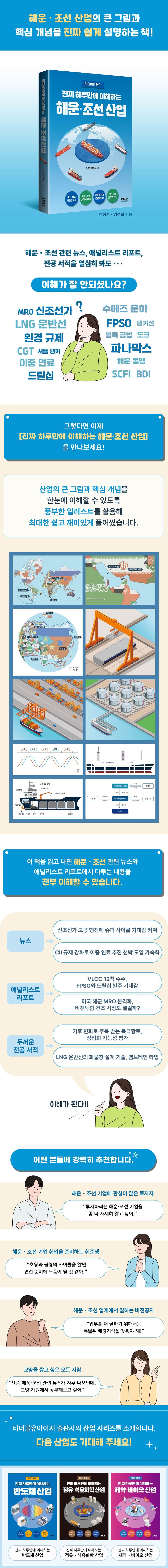 『진짜 하루만에 이해하는 해운·조선 산업』은 이러한 기획 의도 아래 탄생했습니다. 비전공자도 산업의 큰 그림과 핵심 개념을 이해할 수 있도록 다양한 예시와 풍부한 일러스트를 활용해 최대한 쉽게 풀어서 설명했습니다. 이 책이 정책가에게는 정책 방향의 나침반으로, 사업가와 투자가에게는 기회와 리스크를 들여다보는 현미경으로, 취업을 고민하는 취준생에게는 진로를 탐색하는 내비게이션으로서의 역할을 충실히 할 수 있길 바랍니다.