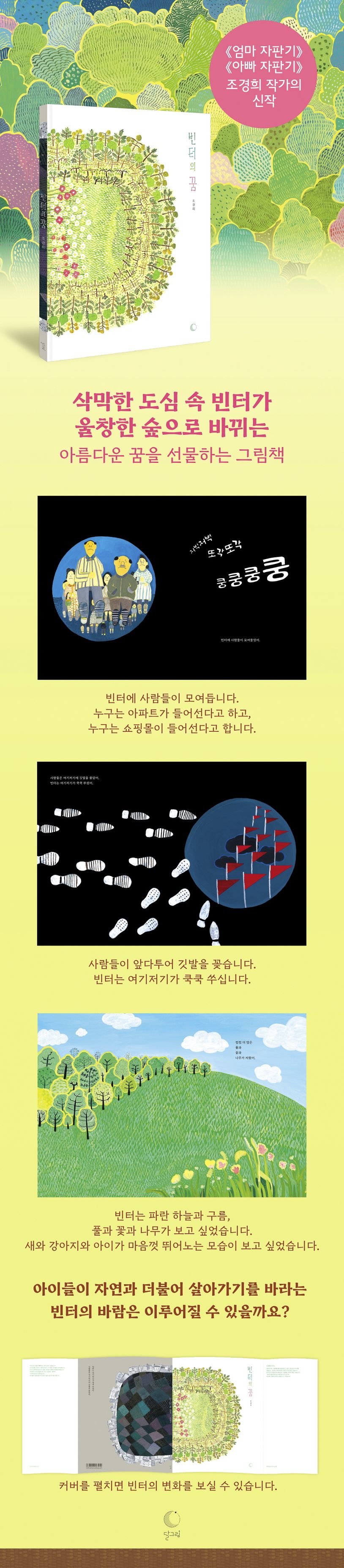 그림책 분야 스테디셀러 《엄마 자판기》, 《아빠 자판기》를 쓰고 그린 조경희 작가가 세 번째 그림책 《빈터의 꿈》으로 독자들을 찾아왔다. 전작들이 ‘자판기’라는 놀라운 상상력과 유쾌한 스토리로 바쁜 엄마, 아빠와 마음껏 놀고 싶어 하는 아이들의 마음을 따뜻하게 어루만져 주었다면, 《빈터의 꿈》은 삭막한 도심에 덩그러니 자리 잡은 빈터가 울창한 숲으로 바뀌는 아름다운 꿈을 독자에게 선물한다.