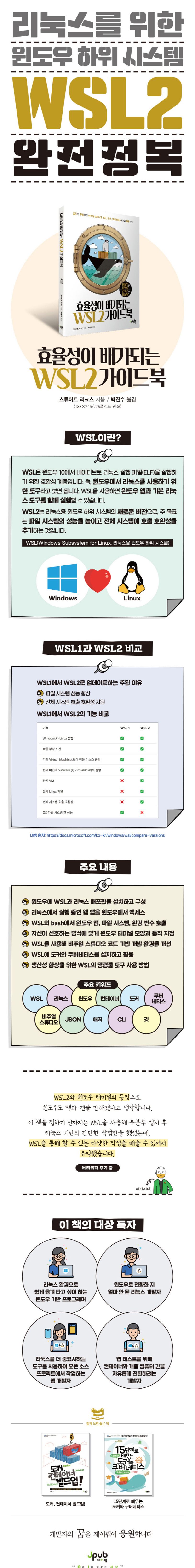 이 책에서는 WSL이 무엇인지 친절하게 설명하고, 다양한 리눅스 배포판을 WSL에 설치하고 구성하는 방법을 살펴봅니다. 그런 후에 윈도우 환경과 리눅스 환경을 동시에 사용해서 개발하는 방법을 살펴봅니다. 그리고 새로 나온 윈도우 터미널을 설치하는 방법과 이를 사용자에게 맞게 구성하는 방법, 또한 WSL과 비주얼 스튜디오 코드를 연동해 코드를 작성하는 방법도 다룹니다. 그 밖에도 도커와 쿠버네티스 기반의 컨테이너를 사용해 일하는 방법과 비주얼 스튜디오 코드를 사용해 개발 환경을 컨테이너 형태로 만드는 방법도 안내합니다.