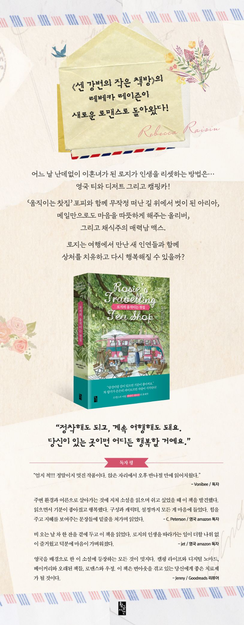 이 소설은 자동차 여행, 영국 각지의 자연과 페스티벌, 차와 디저트, 새로운 만남 등 여행의 모든 로망을 자극한다. 낯선 세상에서 평생 함께할 친구를 만나고 진정한 사랑을 싹틔우는 로지의 여정이 차 향기처럼 향긋하게 느껴진다.