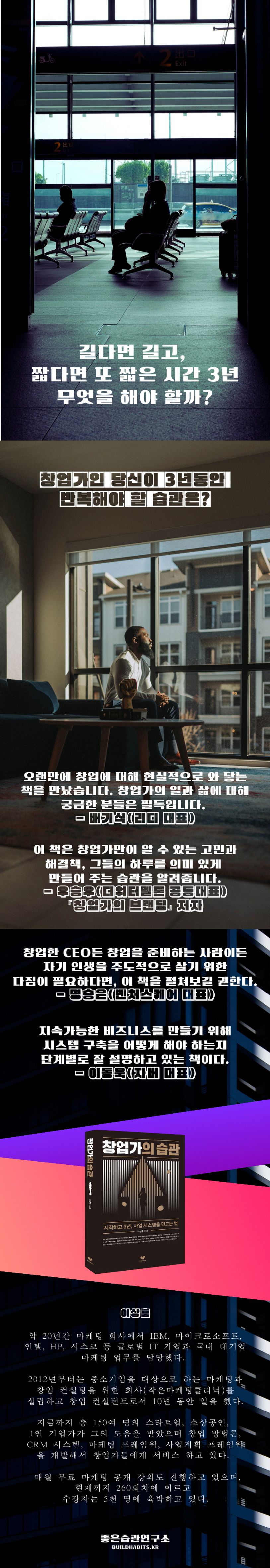 사업을시작하고정상화되기까지창업가는3년이라는 시간 동안 무엇을 반복해야하고 무엇을 루틴으로 삼아야 하는지 알려주는 책입니다.바로 ‘사업 시스템 만들기’입니다.창업가가직접 뛰지 않아도 24시간 사업이 진행되고 구매 전환율이 점점 높아지는 시스템입니다.지난 10년간 100여명의 창업가를 멘토링한 작가의 깨달음과 비법을 한 권에 담았습니다.