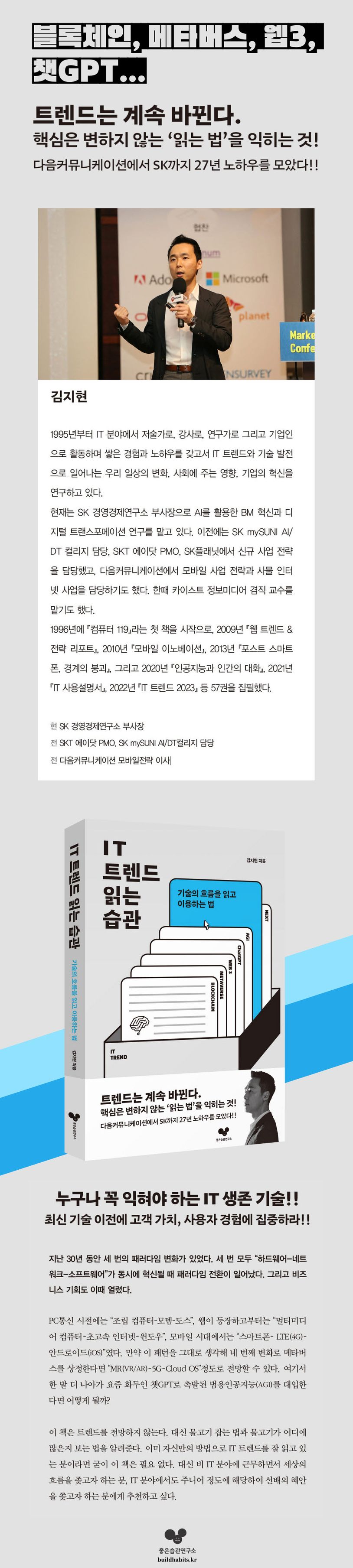 블록체인, 메타버스, 웹3, 챗GPT, AGI… IT 트렌드는 계속 변한다. 하지만 변하지 않는 것은 “트렌드를 읽는 법”이다. 다음커뮤니케이션부터 SK까지, 지난 27년 동안 IT 신사업과 혁신의 주인공으로 활약한 작가의 노하우를 총 23개의 습관으로 정리했다. IT 뉴스를 이해하고 기술의 흐름을 읽고 이용하는 통찰을 배워보자.