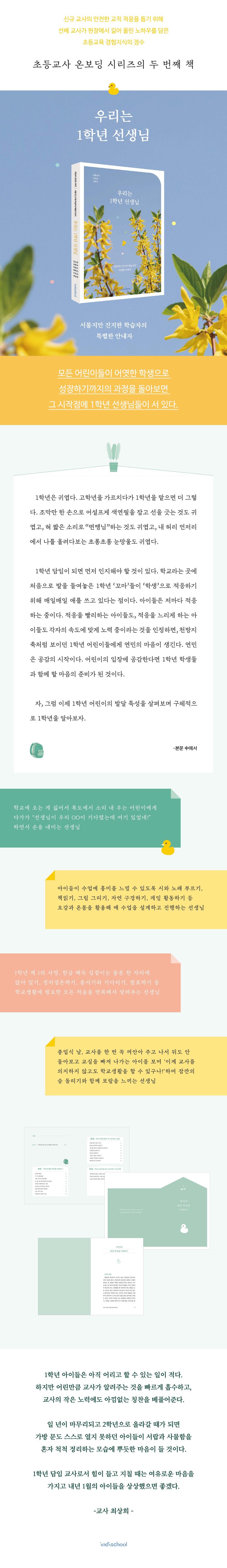 학교라는 세계에 첫발을 내딛은 1학년은 모든 게 낯설다. 1학년 선생님은 모든 것이 낯설기만 한 1학년 아이들이 어엿한 학생으로 발돋움 할 수 있도록 지도하는 ‘1학년의 모든 첫걸음을 함께하는 특별한 안내자’이다. 모든 어린이들이 어엿한 학생으로 성장하기까지 그 시작점에 1학년 선생님들이 서 있는 것이다.
