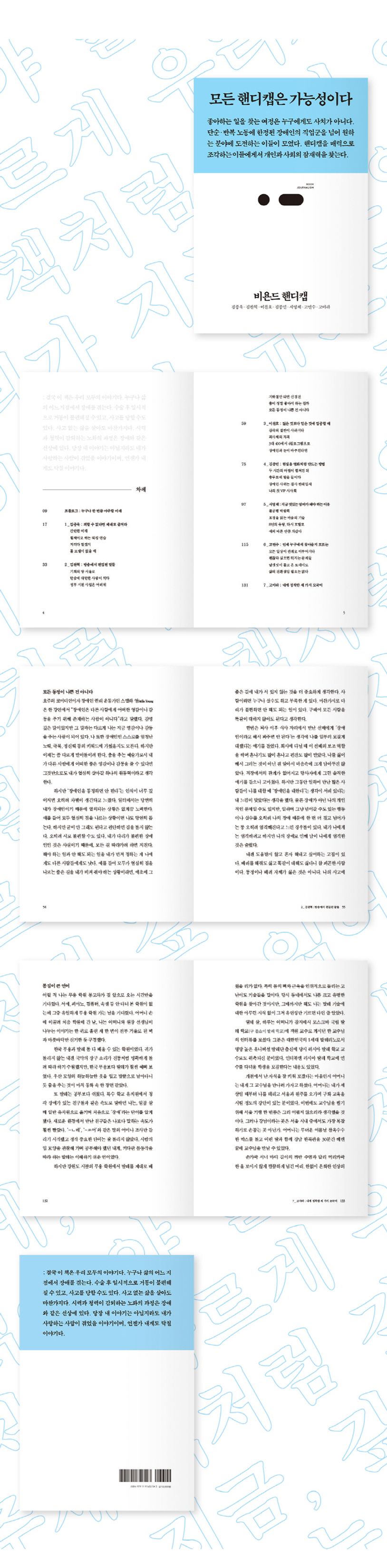 누구나 삶의 어느 지점에서 장애를 겪는다. 수술 후 일시적으로 거동이 불편해질 수 있고, 사고를 당할 수도 있다. 사고 없는 삶을 살아도 마찬가지다. 시력과 청력이 감퇴하는 노화의 과정은 장애와 같은 선상에 있다. 결국 이 책은 우리 모두의 이야기다. 당장 내 이야기는 아닐지라도 내가 사랑하는 사람이 겪었을 이야기이며, 언젠가 내게도 닥칠 이야기다. 모델 김종욱, 비보이 김완혁, 모델 이찬호, 영화감독 김종민, 모델 서영채, 웹툰 작가 고연수, 발레리나 고아라의 목소리를 담았다.