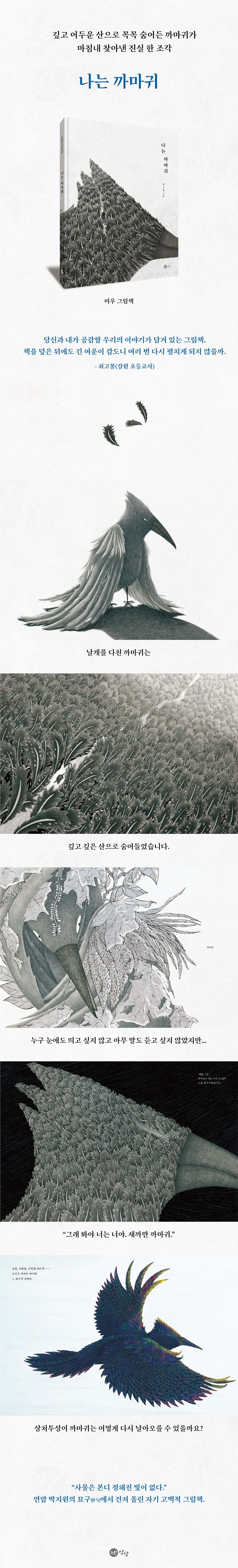 날개를 다친 까마귀는 몸도 마음도 너덜너덜해진 채로 깊은 산에 숨어든다. 누구도 알아보지 못하도록 온몸을 꼭꼭 가리지만, 우렁우렁 울리는 산의 목소리는 틀어막은 귀를 파고든다. “너 까마귀로구나. 까맣고 불길한 까마귀. 애써 아닌 척해 봐야 너는 너야. 새까만 까마귀.” 깊은 어둠 속으로 침잠하여 기나긴 밤을 보낸 까마귀에게 현자의 목소리가 들려온다. “까마귀가 늘 까맣기만 한 건 아니지. 하늘빛에 물들어 금빛으로도, 자줏빛으로도, 비췻빛으로도 빛나거든.” 애써 부정하던 자신을 받아들이며 까마귀는 힘차게 날아오른다.