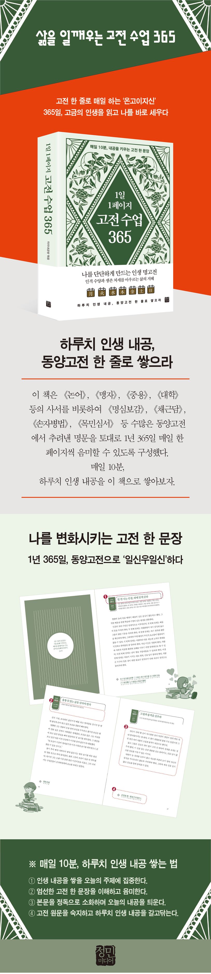 이 책은 《논어》, 《맹자》, 《중용》, 《대학》 등의 사서를 비롯하여 《명심보감》, 《채근담》, 《손자병법》, 《목민심서》 등 수많은 동양고전에서 추려낸 명문을 토대로 1년 365일 매일 한 페이지씩 음미할 수 있도록 구성했다. 매일 10분, 하루치 인생 내공을 이 책으로 쌓아보자.