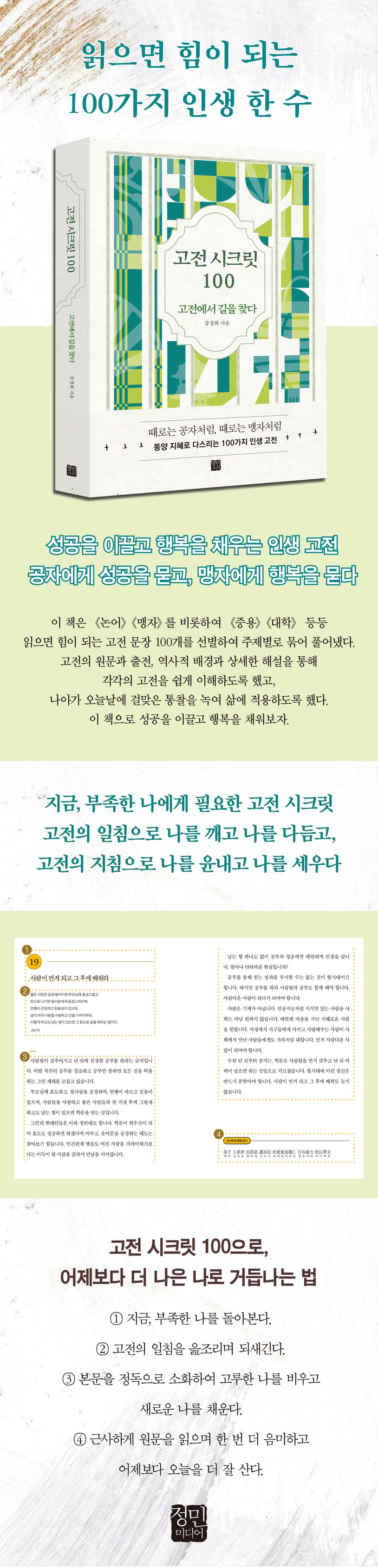 이 책은 바쁜 현대인들이 꼭 알면 좋을 고전 문장 100개를 선별하여 주제별로 묶어 풀어냈다. 고전의 원문과 출전, 역사적 배경과 상세한 해설을 통해 각각의 고전을 쉽게 이해하도록 했고, 나아가 오늘날에 걸맞은 통찰을 녹여 삶에 적용할 수 있도록 하는 데 역점을 두었다. 이 책을 통해 생의 희망을 품으며 다시금 잘 살아보자. 이 책이 성공을 이끌고 행복을 채워줄 것이다.