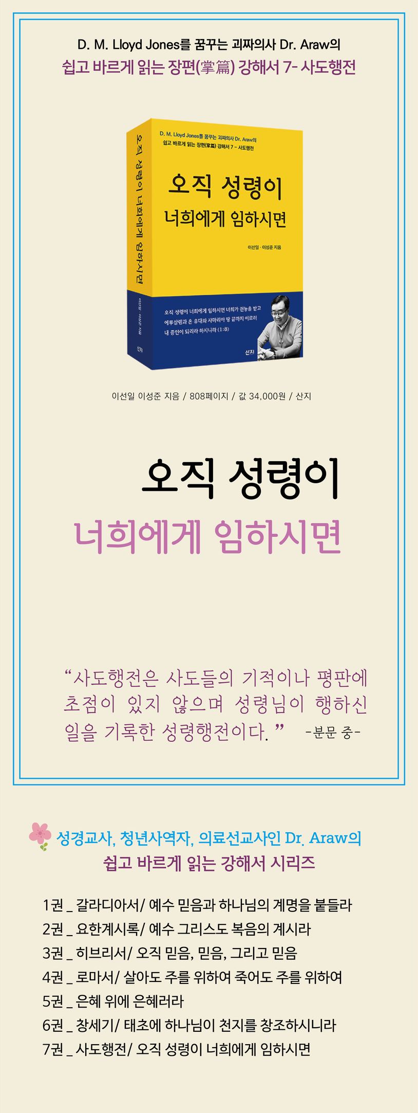 사도행전은 성령행전이라고도 일컫는다. 사도행전이 사도들의 발자취를 기록했지만 한 걸음 한 걸음 성령님에 의해 인도되어지는 여정이기에 성령행전이라고 불리기도 하는 것이다. 저자는 ‘사도행전이 처음부터 마지막까지 성령님의 약속, 내주(內住) 성령, 성령의 은사, 성령세례와 성령충만, 성령님의 권능과 증거, 성령님의 인도하심 등등 성령님의 강림과 활동에 관해 말씀하고 있다’고 말한다.