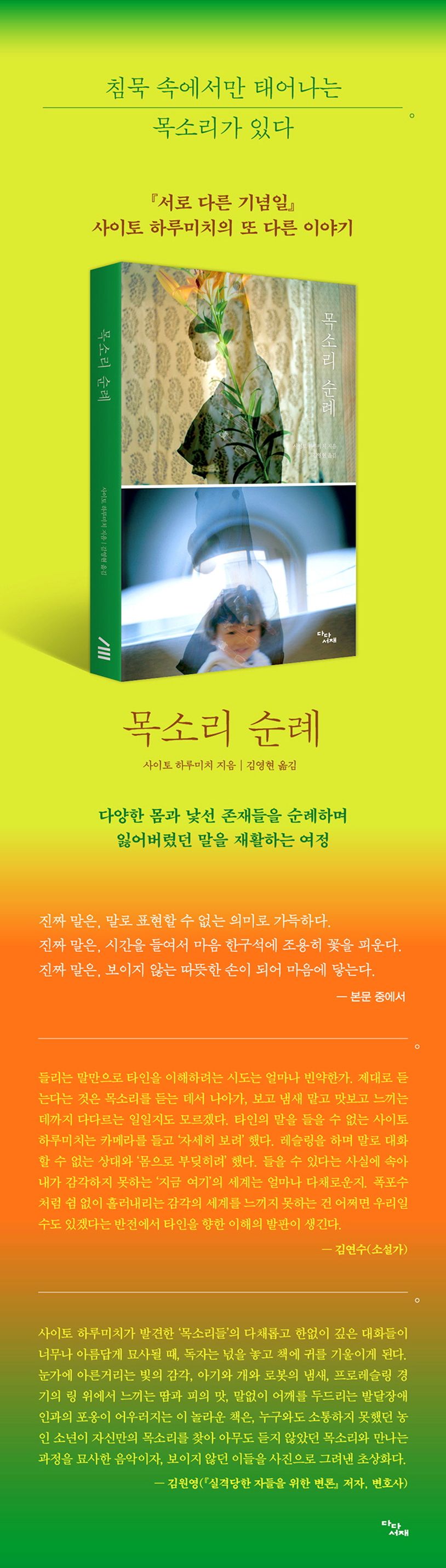 『목소리 순례』는 농인 사진가 사이토 하루미치가 다양한 존재들을 만나 진정한 내면의 목소리를 찾아가는 여정을 담은 에세이다. 전작 『서로 다른 기념일』로 서로 다른 감각을 지닌 존재와의 소통을 감동적으로 그려냈던 저자는 이 책에서 청각장애를 극복하려 했던 어린 시절부터 장애를 인정하고 농인으로 살아가며 접한 다양한 언어와 감각에 대한 내밀한 고백을 전한다.