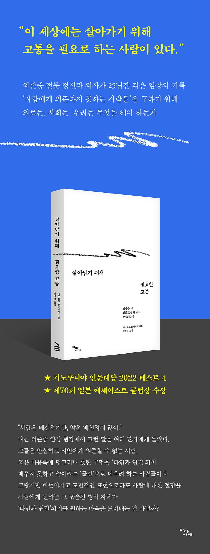 『살아남기 위해 필요한 고통』은 약물 의존증 최고 권위자인 일본의 정신과 전문의 마쓰모토 도시히코가 쓴 에세이다. 처음 약물 의존증과 마주한 중학생 시절부터 아웃사이더 의대생을 거쳐, 본의 아니게 의존증 전문병원에 발령받으며 시작한 약물 의존증 임상과 소년교정, 법정신의학, 자살 예방 연구 등 의사로서 25년간 경험한 일을 담았다. 저자는 약물 의존증은 범죄가 아닌 병이며, 약물 의존증 환자는 ‘사람에게 의존하지 못하는 사람’으로 처벌이 아니라 치료와 연결을 지원해줘야 한다고 말한다. 아무것도 모르던 신출내기 시절 환자에게 혼이 났던 일, 의사로서 미숙해 환자를 돕지 못하고 잃었던 일, 의존증 환자를 도우면서 스스로도 힘든 일상을 이겨내기 위해 게임에 의존했던 일 등 저자가 들려주는 소탈하고 진솔한 이야기가 감동을 전한다.