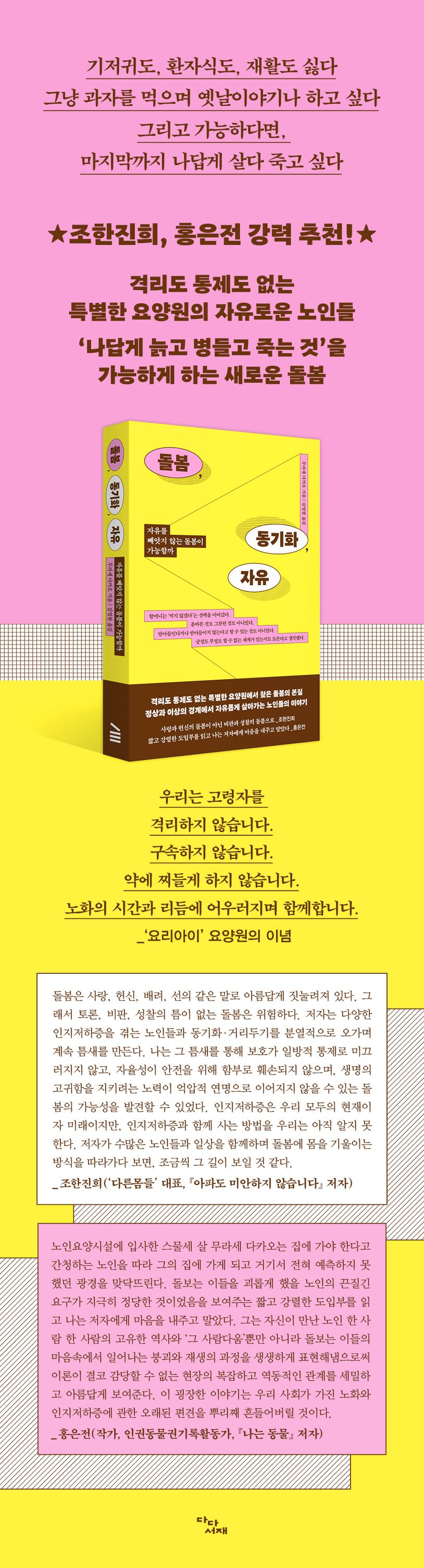 이 책은 특별한 요양원에서 지내는 여러 노인들의 일상을 통해 노화와 인지저하증에 대한 기존의 시각을 완전히 탈피함과 동시에 이론에 담기지 않는 돌봄의 본질, 현장에서 일어나는 불가사의한 상호작용, 돌봄과 자유의 공존, 시설의 탈시설화 가능성 등 ‘돌봄’을 둘러싼 다양한 주제를 고찰한다.