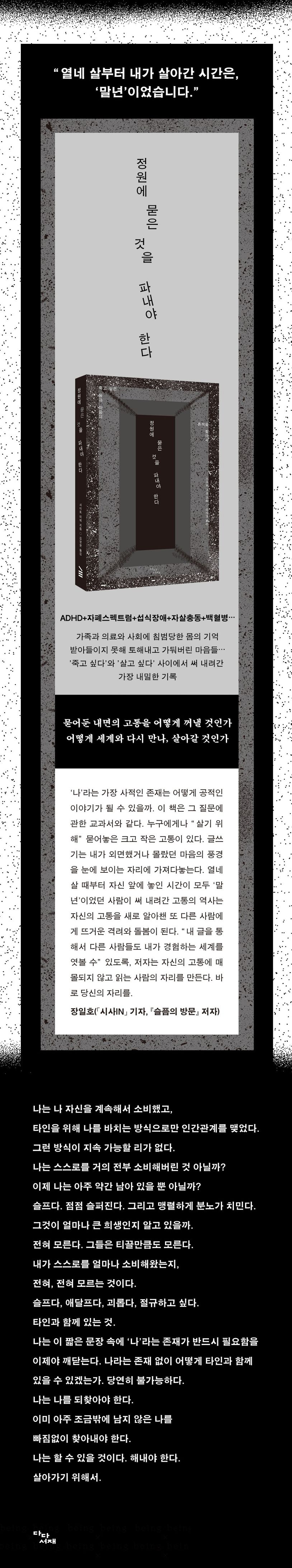 『정원에묻은것을파내야한다』는ADHD,자폐스펙트럼,섭식장애,급성골수성백혈병등여러질환과장애당사자인저자가반복되는자살성사고와적응장애로고통받아온자신의삶을돌아보며쓴기록을엮은책이다.자신에게나타난증상과겪어온일을담담하게서술하는1부와논픽션과픽션의경계를넘나들며누구에게도말하지못한내면의고통을탐구한2부로구성된이책은‘투병기’나‘회복기’가아니다.끊임없는자살충동에시달리면서도모순투성이인자신을이해하려하고,자신에게상처입힌세상과대면하고자하는저자의고백록은뜻밖에도생에대한의지와희망을가득품고있다.저자는자신처럼삶과죽음의경계에있는사람들이“살아갈수있길바라”는마음으로이책을썼다고말한다.