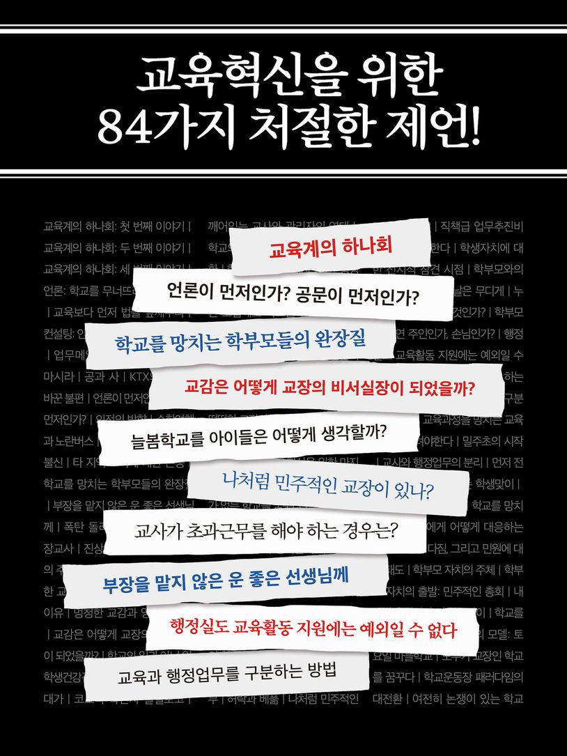 이제는 워낙 자주 언급되어 진부하게 들리기까지 하는 역사상 유래가 없던 대격변의 시대를 살아내고 있다. 그럼에도 변하지 않는 것들 중의 하나가 ‘교육’이다. 하지만 연이은 교사들의 죽음과 학생들의 자살… 등 실제 우리 교육은 혼돈과 무기력에 빠져 있는 것이 현실이다. 학교 현장에는 여전히 모두 들춰낼 수 없는 안타까운 장면과 비밀스런 사연들이 존재하고 있다. 뿐만 아니라 끊임없이 새로운 문제들이 생겨나기도 한다. 하지만 권력을 움켜쥔 관리자가 아니라 교사를 지원하는 지원자로, 교실을 지키는 선생님으로, 아이를 학교에 보낸 학부모로서 각자의 자리에서 고군분투하고 있는 장면들을 여러 곳에서 만날 수 있다.