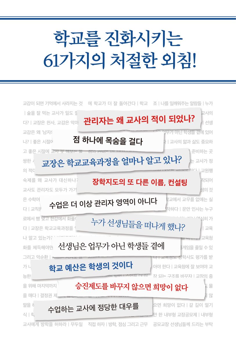 나는 교감으로 발령받은 후 새로운 관리자상을 만들어가기 위해 많은 적폐와 싸우며 꿋꿋하게 헤쳐 나가고 있다. “당신만 교감인가? 당신 다음 교감은 어찌하라고? 그냥 교사하지 교감은 왜 되었나?”라는 온갖 조롱과 멸시와 싸우며 자리가 사람을 만드는 게 아니라 관리자가 자리를 만들어 왔음을 증명해 보이려고 노력했다. 그리고 이 책을 집필하는 동안 끊임없이 스스로의 모습을 돌아보고 반성하였다. 권위는 내가 만드는 것이 아니라 다른 사람이 만들어주는 것이다. 남들이 만들어주는 그 권위마저 벗어던져야 한다. 권위를 권력과 혼돈하지 않아야 한다. 교감으로서의 민주적 삶이 책에 묻어날 수 있도록 행동하고 실천해야 한다고 다짐했다.