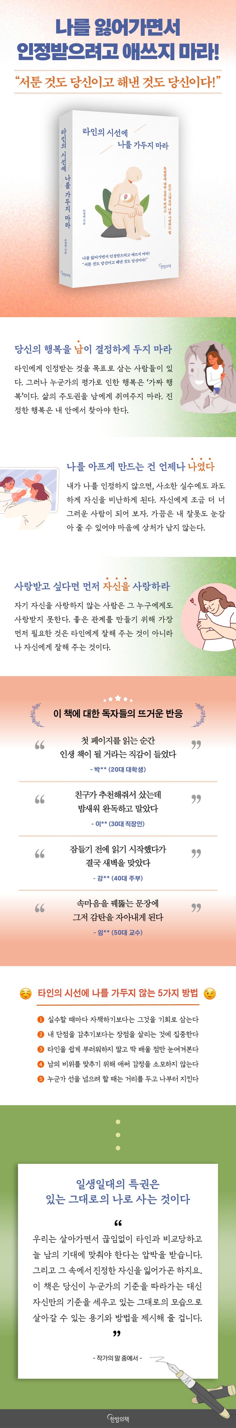 이 책, 《타인의 시선에 나를 가두지 마라》에서 제시하는 가르침을 바탕으로 주변 사람들의 평가에 휘둘리는 삶에서 벗어나 진정한 나를 발견하는 방법을 익혀보자. 지금 내가 내린 결정들이 오롯이 내 행복을 위한 것인지, 아니면 누군가의 평가를 염두에 둔 것인지 스스로에게 물어보고, 있는 그대로의 나를 바라보는 법을 배우게 될 때, 비로소 온전한 행복이 시작된다.