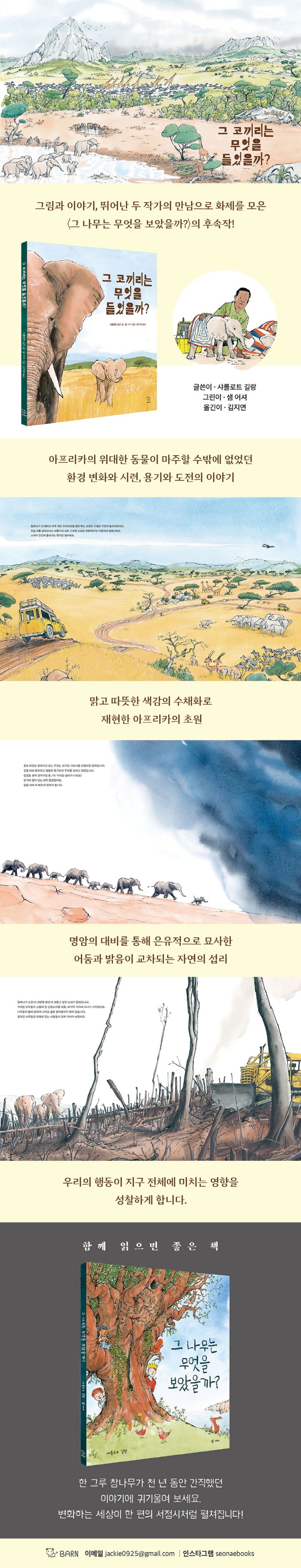 코끼리가 화자가 되어 들려주는 이야기의 이면에는 다른 생명체들의 서식지를 파괴하고 그들의 생존을 위협하는 인간의 활동에 경종을 울리는 메시지가 담겨 있습니다. 우리 인간 또한 거대한 자연의 구성원으로서 책임감을 가지고 공존을 위한 길을 찾아야 한다는 지극히 당연한 사실을 그림과 이야기로 전달합니다.