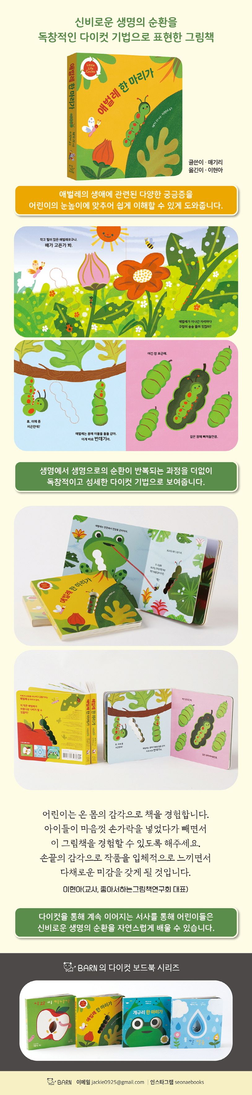 세상은 계속 움직이고 변화하고 자연도 끊임없이 자신의 모습을 바꾸어 갑니다. 『애벌레 한 마리가』는 나비가 짧은 생을 마치고 원점으로 돌아가는 과정을 더없이 독창적인 다이컷 기법으로 표현하였습니다. 다이컷을 통해 계속 이어지는 서사를 통해 어린이들은 신비로운 생명의 순환을 자연스럽게 배우게 될 것입니다.