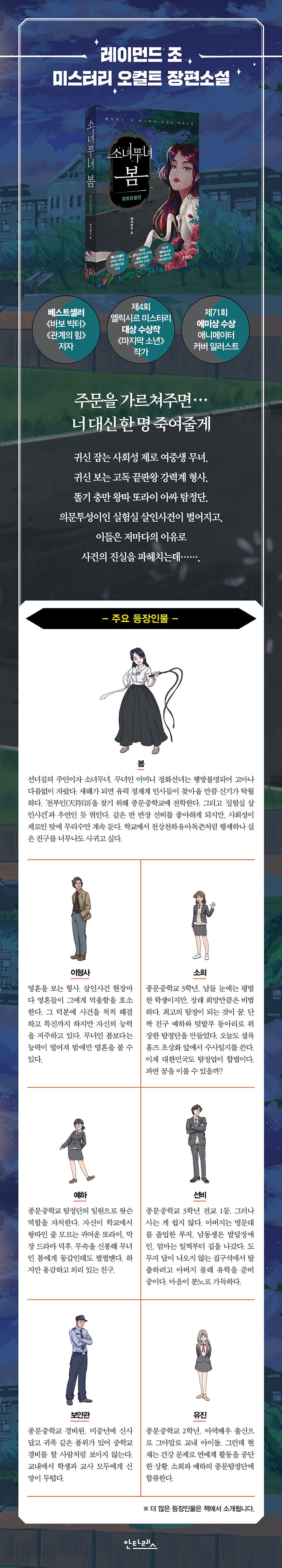 『소녀무녀 봄』은 베스트셀러 『바보 빅터』『관계의 힘』의 작가이자 『마지막 소년』으로 제4회 엘릭시르 미스터리 대상을 수상해 소설가로서 정체성을 확보한 레이먼드 조의 미스터리 오컬트 장편소설이다. 총 3부작 옴니버스 시리즈로서 이번 ‘청동방울편’이 제1부이며, 제2부 ‘청동거울편’과 제3부 ‘청동검편’까지 각각 완결된 이야기 형식으로 작품을 이어나간다. 커버 및 캐릭터 일러스트는 넷플릭스(Netflix) 오리지널 애니메이션 시리즈 「러브, 데스 + 로봇」 시즌 1 ‘굿 헌팅(Good Hunting)’으로 제71회 에미상(Emmy Award)을 받은 애니메이터 김준호 감독이 직접 그렸고 향후 작품에도 참여한다.