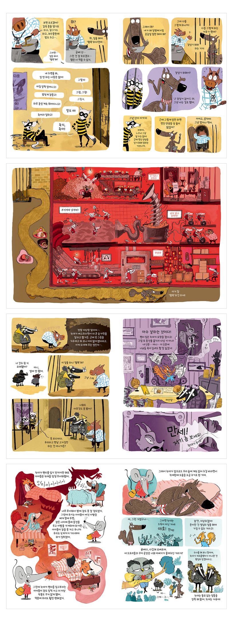 감옥에 갇힌 채 풀이 죽어 있는 팬티 입은 늑대에게 옆방 수감자들이 충고합니다. ‘네 행동에 화가 난 거야. 네가 노는 동안 남들은 계속 일했거든. 네 주변을 봐, 일 안 하는 사람은 없어! 아침 일찍 일어나고! 밤늦게 잠들고! 하루 종일 계속 뛰어다니고! 죽어라 일하고!’ 그러자 늑대가 말합니다. ‘그래서 뭐? 내가 왜 일벌레처럼 온종일 일만 해야 해?’ 다들 잘살기 위해서 그렇게 하는 거라는 대답에 자신은 잘살지 않아도 된다고, 그냥 사는 걸로 됐다고 말하는 늑대. 누구나 그냥 살 수는 있지만 멋진 인생을 살기 위해 일하는 거라고 생각할 겁니다. 그런데 그렇게 일만 하면 멋진 인생을 살 틈이 없지 않느냐고 묻는 늑대를 통해 작가는 노동의 가치와 참의미, 일과 진정한 행복, 나아가 자본과 착취, 연대에 대해 돌아보게 합니다.