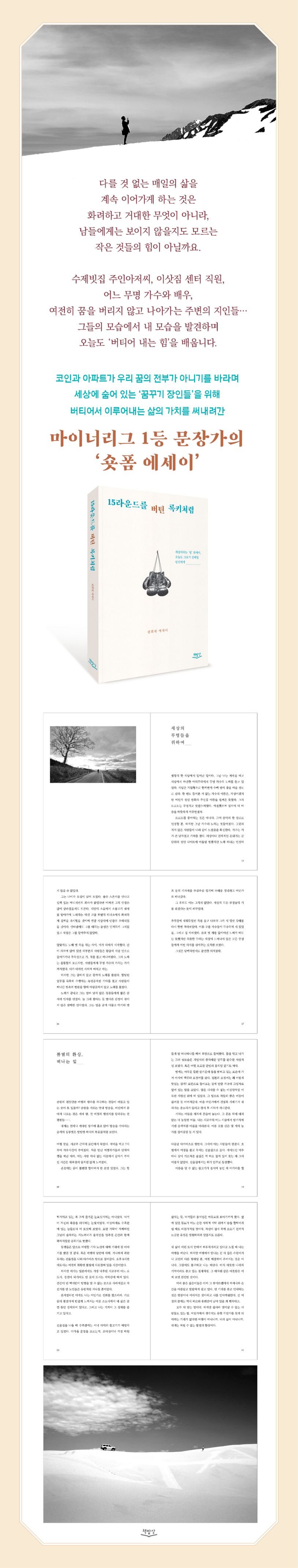매일이 그로기 상태인 우리를 버티게 하는 것은, 으리으리한 그 무엇이 아니라 남들에게는 보이지 않을지도 모르는 ‘작은 것들의 지속적인 힘’이다. 꺾이지 않는 마음으로 20년 동안 문장을 가꿔온 작가가 일상과 여행 속에서 만난, 자신만의 꿈을 향해 하루를 나아가는 사람들의 이야기를 첫 책으로 담았다. 화려하지도, 빛나지도 않지만 묵묵히 오늘을 살아가는 보통 사람들의 작은 이야기들은 간결하고 주제가 선명한 ‘숏폼’ 형식에 담겨, 인상적인 감동을 전한다. 상황을 반전시켜 해석하는 작가의 위트와 그가 찍은 사진은 이 작은 이야기들을 더 깊이 이해해 ‘삶의 큰 이야기’로 받아들이게 만든다.