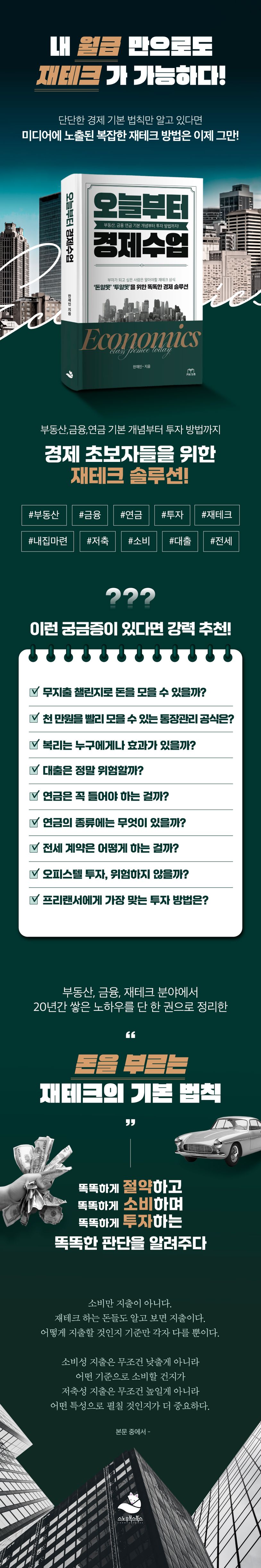 어떻게 재테크를 해야 하는지, 성공으로 가는 재테크의 방식은 무엇인지 재테크가 낯설기만한 초보자에게 『오늘부터 경제수업』은 경제ㆍ재테크 교과서이자 멘토링이 되어줄 것이다.