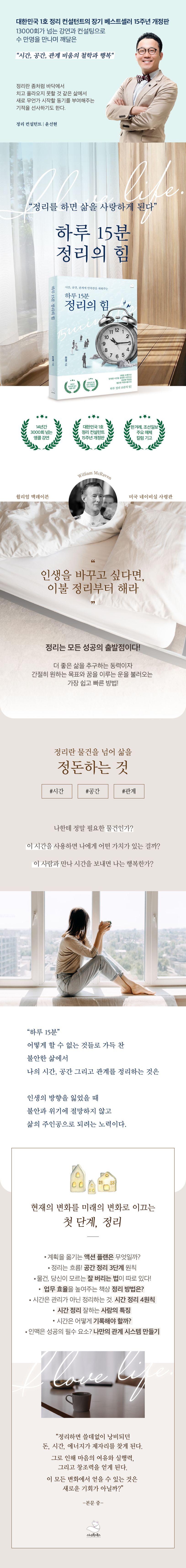 정리란 시공간의 독소를 빼는 행위이고, 어지럽고 산란한 마음을 말끔하게 정돈하는 행위로써 1부에서는 정리가 삶을 얼마나 긍정적으로 변화시킬 수 있는지를 살핀다. 2부에서는 정리와 청소라는 비움의 행위를 토대로 큰 성취를 거둔 이들을 알아본다. 부록으로 제안돼 있는 체크리스트와 액션플랜으로 자신의 정리정돈 능력을 파악하고, 더 나은 방향으로 개선할 수 있는 인사이트를 담았다.