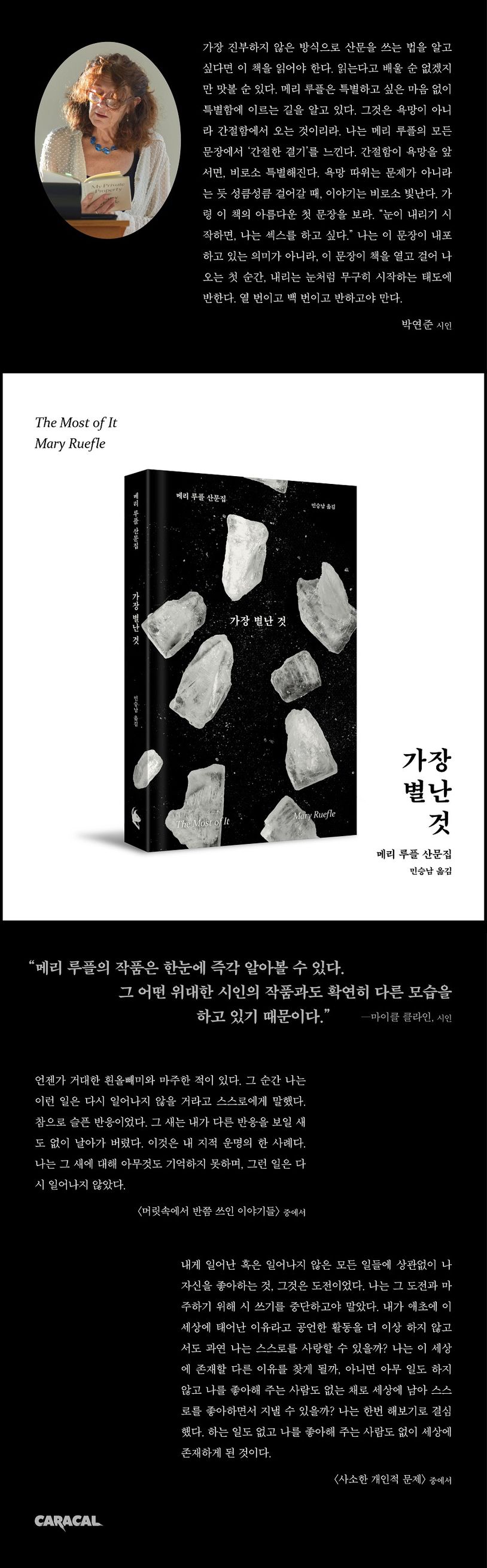 국내에 처음 소개되어 신선한 충격을 던진 《나의 사유 재산》 이후 두 번째로 번역·출간된 메리 루플 작품집. 《가장 별난 것》은 메리 루플이 시인이 되고 나서 30여 년이 지난 뒤에야 펴낸 첫 산문집으로, 그만의 기이하고 독특한 문학성의 원류를 선연히 확인해 볼 수 있는 글들로 가득하다. 이 책에서 루플은 알베르 카뮈의 단편소설 〈자라나는 돌〉에 스치듯 등장하는 ‘노란 스카프의 여인’을 상상 속에서 추적하고, 교실 칠판에 덩그러니 적힌 문장이 스스로에 대해 품을 법한 생각을 그린다. 냉장고, 벤치, 일기, 이끼와 같은 평범한 사물들을 이야기의 중심에 세움으로써, 오직 그러한 방식으로만 발견될 수 있는 삶의 의미들을 포획한다.