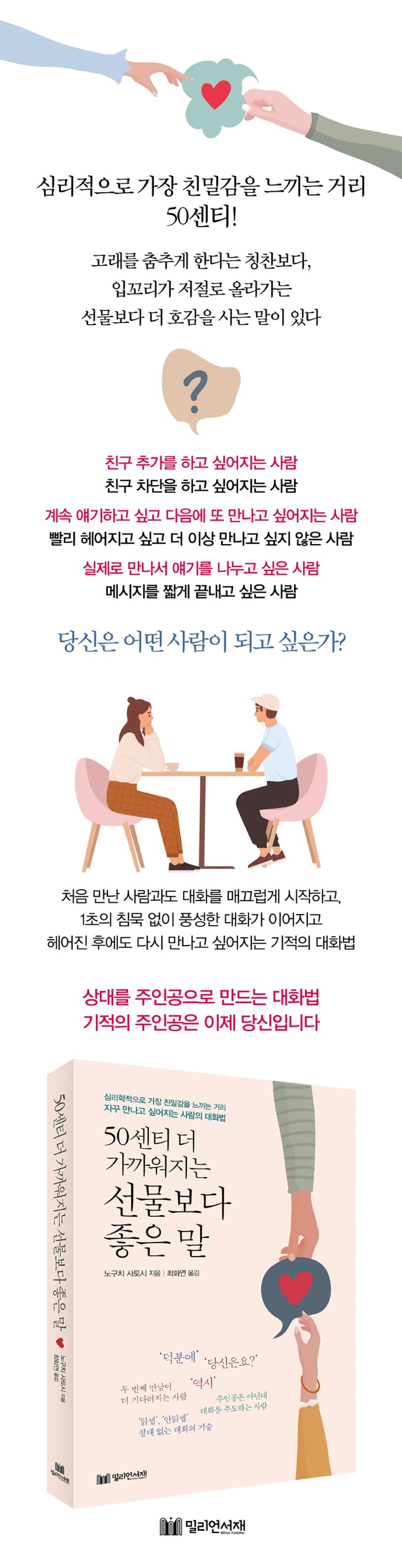 말주변 없는 영업사원이 엄청난 실적을 내고, 소소한 잡담에도, 동료들과의 모임에서도 대화에 활기를 가져오고, 호감 있는 상대의 마음을 사로잡는 대화법. 상대방을 대화의 주인공으로 만들면 인간관계에도 극적인 변화가 찾아온다. 상사, 부하직원, 고객, 마음에 드는 이성, 학부모 모임, 친구, 가족 등 상대가 누구든 긍정적인 결과를 얻을 수 있다. 상대를 주인공으로 만들고, 특별한 존재로 끌어올리는 순간 나 역시 특별한 사람이 되는 기적의 대화법.