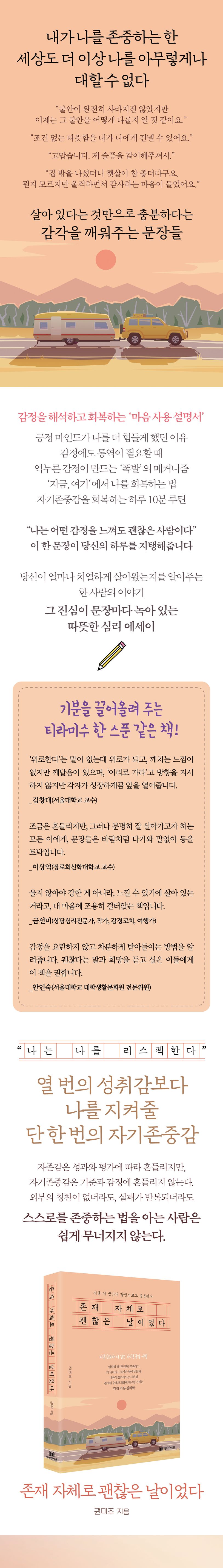 세상의모든사람들이나에게엄격한잣대를들이대고평가하는데,나조차나를평가하려든다면나자신이설곳은어디에도없다.왜냐하면인간이란늘불완전하고흔들리며살아가는감정의동물이기때문이다.내가지금느끼는감정이어떤것이든억누르지않고,부정하지않고,있는그대로받아들이는태도가자기존중의첫걸음이다.“이런감정을느껴도괜찮아”,“이상황에서슬플수있어”라고자신을있는그대로받아들일수있다.