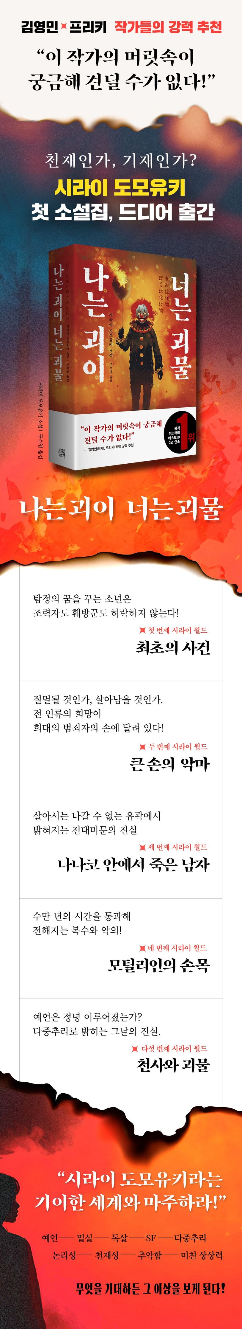 무서운 기세로 ‘본격 미스터리’의 최전선을 넓혀온 시라이 도모유키의 첫 소설집 《나는 괴이 너는 괴물》이 드디어 한국 독자들을 만난다. 동급생 습격을 좇는 초등학교 명탐정(〈최초의 사건〉)과 절멸을 앞둔 인류의 명운을 짊어진 범죄자(〈큰 손의 악마〉), 유곽을 휩쓴 연쇄 독살사건(〈나나코 안에서 죽은 남자〉), 수만 년 전 화석의 수수께끼(〈모틸리언의 손목〉), 오래전의 예언을 증명하듯 일어난 밀실사건(〈천사와 괴물〉)에 이르기까지, 배경부터 장르까지 다종다양한 다섯 가지 이야기가 독자를 맞는다. 예언, 밀실, 독살, SF, 다중추리… 모든 장치가 폭죽처럼 터지지만, 서사는 견고하고 퍼즐은 한층 정교해졌다. 불편함과 쾌감이 교차하는 그 지점에서 시선을 거두지 못하게 하는, 장르를 한계까지 밀어붙이는 작가의 필력이 ‘역시 시라이 도모유키!’라는 탄성을 터뜨리게 한다.
